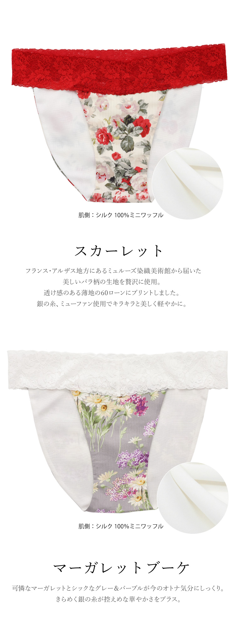 | 滑らかな手触りのシルクと絵画の様に美しい花柄プリント生地を贅沢に使用したリラックスショーツ。そけいぶゴムフリーでリンパを開放、ふんどしパンツとは思えないランジェリーのように繊細なデザイン。 お洒落な冷え取りショーツが欲しい大人の女性におすすめです。ハッとするほど美しいプリントが下着選びを楽しく、毎日を豊かな気持ちに。やわらかストレッチレースでウエストをしめつけず、やわらかな肌ざわり。肌に当たる面はシルク100%のふんわりストレスフリーな履き心地です。シルクは女性のお肌に嬉しい天然の機能性繊維。デリケートゾーンに毎日シルクを纏って、自然な美肌へ。 |